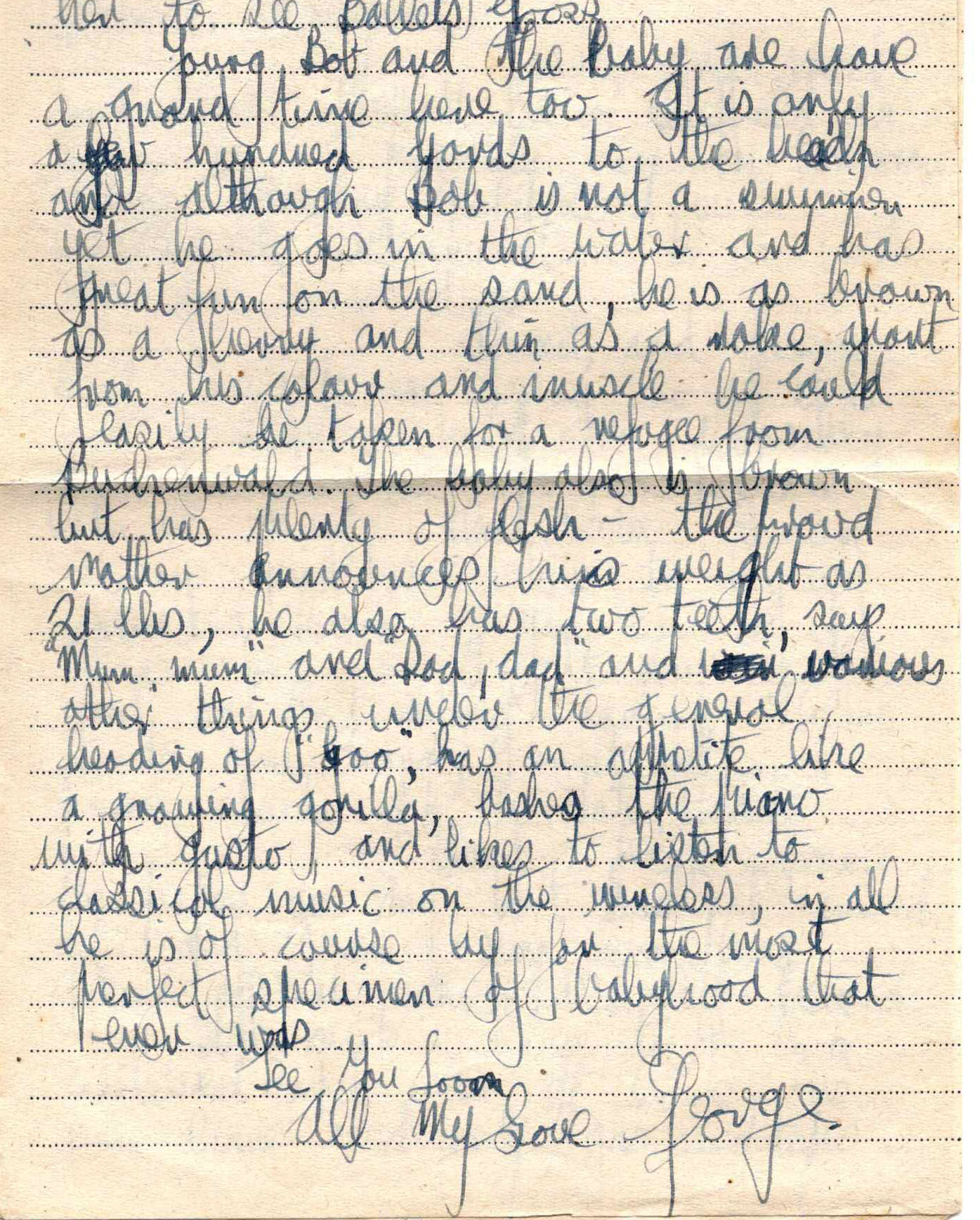 From a letter dated July 16th 1945, from 43 Thorpedene Gardens, Shoebury, from George Edmund Hall to Margaret Patricia Smith - "Young Bob and the Baby are have a grand time here too. It is only a few hundred yards to the beach and although Bob is not a swimmer yet he goes in the water and has great fun on the sand, he is as brown as a berry and thin as a rake, ? from his colour and muscle he could easily be taken for a refugee from Buchenwald. The baby also is brown but has plenty of flesh - the proud mother announces his weight as 21 lbs, he also has two teeth, says 'Mum, mum' and 'Dad, dad' and various other things under the general heading of 'goo', has an appetite like a growing gorilla, bashes the piano with gusto and likes to listed to classical music on the wireless, in all he is of course by far the most perfect specimen of babyhood that ever was."